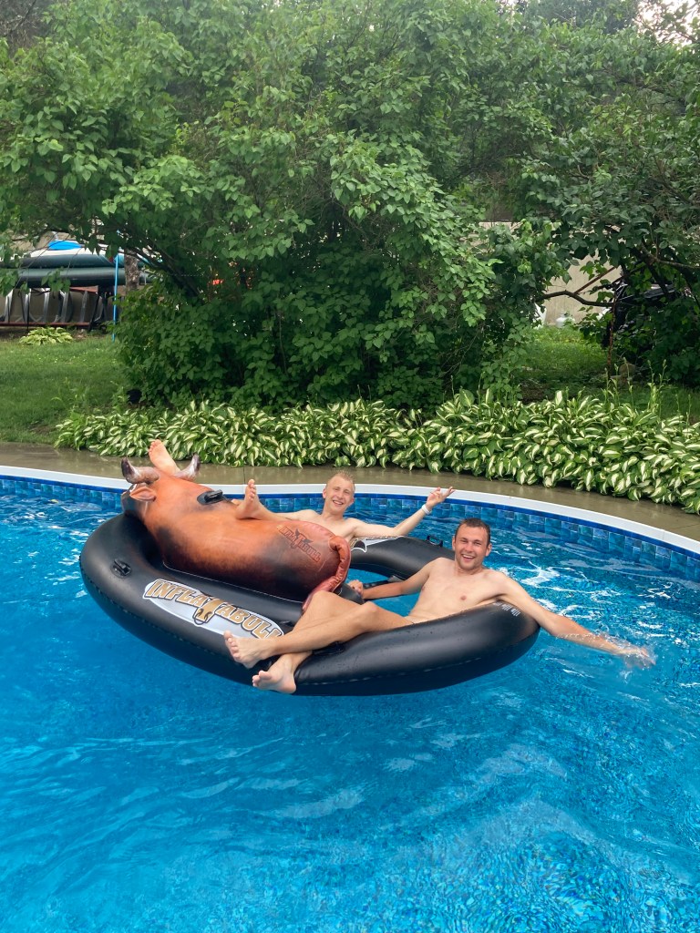 Gusti ja Mattias host-pere basseinis pulliga ratsutamas🐂