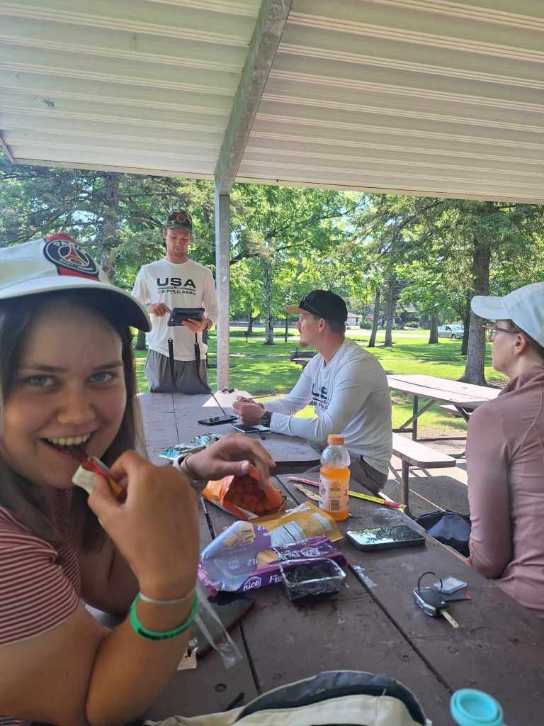 Annabel – See nädal kutsuti mind sõitma nii vägeva motika kui ka väga ilusa autoga. Pidin ei ütlema, kuna ma ikkagi tubli ja korralik ning teen tööd siin Ameerikas. Kohtasin ka inimest kes teab meie oma discgolfarit Kristin Tatarit. Ameeriklased on ikka huvitav rahvas, nad kastavad oma muru ja isegi siis kui vihma sajab ja muruniitmist võtavad ka jube tõsiselt siin. Olen avastanud, et maapähklivõi on leidnud koha minu südames. Nägin seenädal ka rohkelt loomakesi. Ussikesi, kalkuneid, hanesid, kilpkonnasid, jänkusid ja oravaid on ikka igal pool. Nägin ka papagoid kes viidi lapse vankriga sõitma. See nädal püüdsin kinni ka energy is a choice käepaela tehes iga päev keskmiselt 13.30h. Ja ega see nädalgi jäänud vih taevasse. Laupäeval oli äikesetorm. Tegin vahepeal sokikuivatus pausi.