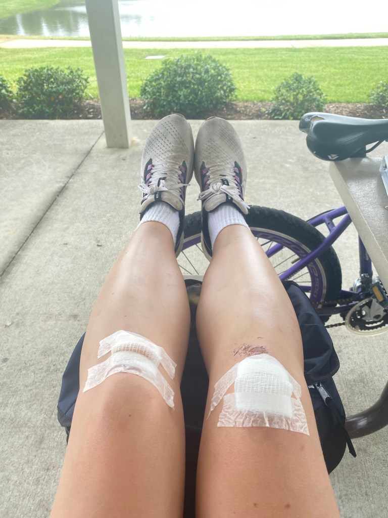 “Tuli välja, et mul on veel arengumaad rattaga sõitmises ja see selgus peale teise põlve katki kukkumist. Päev oli kohe algusest vihmane ja keegi ei teinud uksi lahti ja siis veel rattalt kukkumine sinna otsa. Õnneks paari koputuse pärast tuli uksele Heidy, kes lasi mind tuppa, “tegi mu põlved korda” ja andis terve esmaabi karbikese kaasa. Lisaks andis terve karbi batoonikesi ja kaks pudelit vett.”