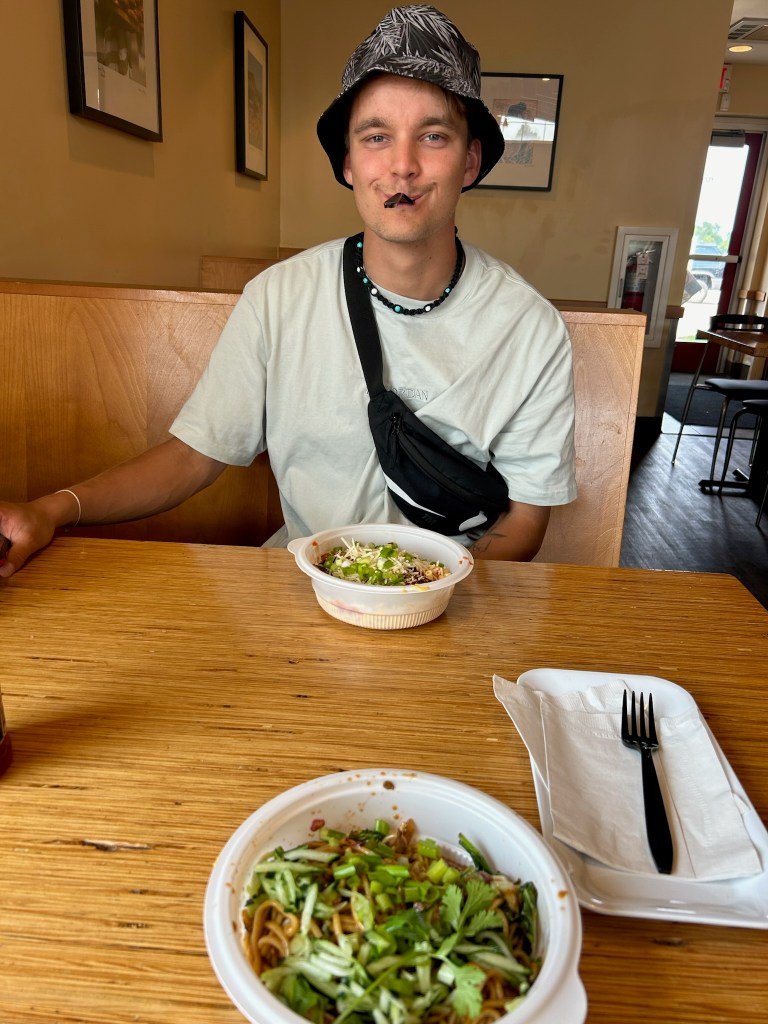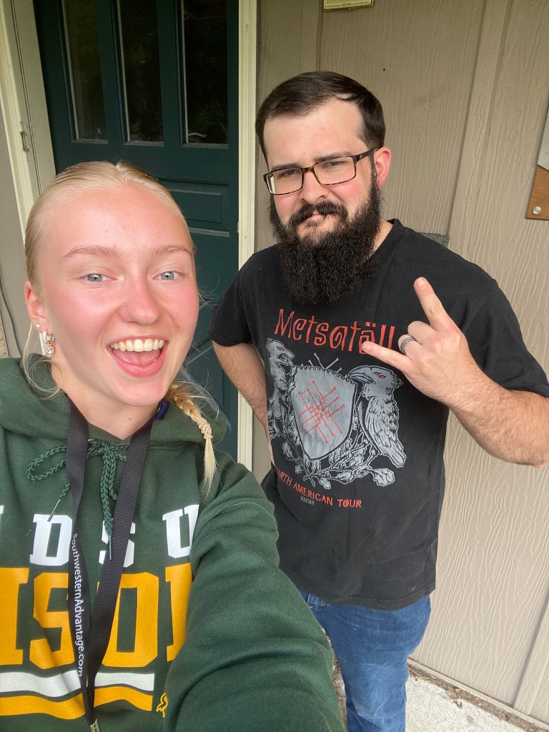 Dalton igatahes hakkas mulle kohe Metsatöllust rääkima. Ta on käinud kontserdil, Metsatöllu kuulates üles kasvanuda ja kuulab siiani. Pani isegi särgi spetsiaalselt pildi jaoks selga. Lisaks on ta vaadanud kõikvõimalikke filme meie kultuuri ja ajaloo kohta + erinevaid toite üritanud järgi proovida, näiteks pelmeene ja kompotti😀 Küsis ka minult soovitusi, mida teha, kui tal peaks õnnestuma Eestisse tulla ja mis sööki ta saaks järgi proovida. Saatsin ta rappa ning soovitasin kartuleid hakklihakastmega ja verivorsti.