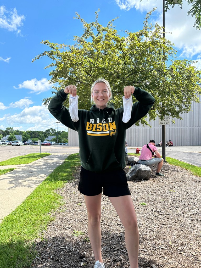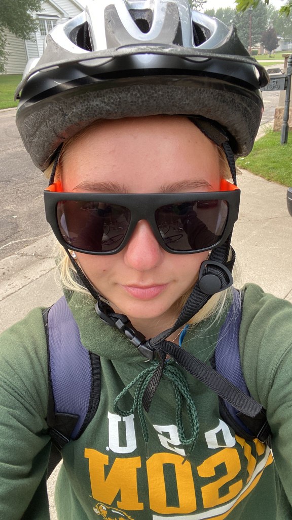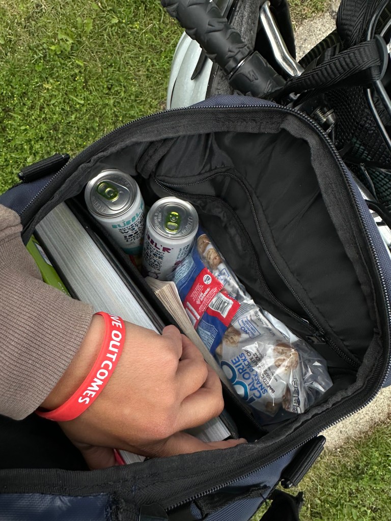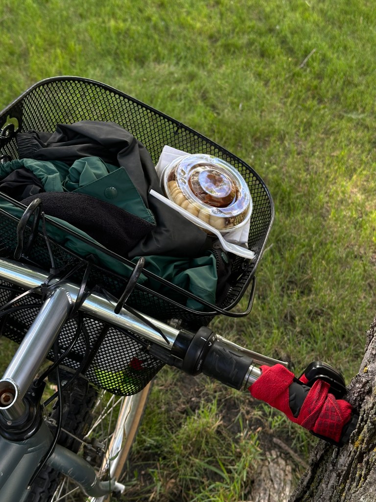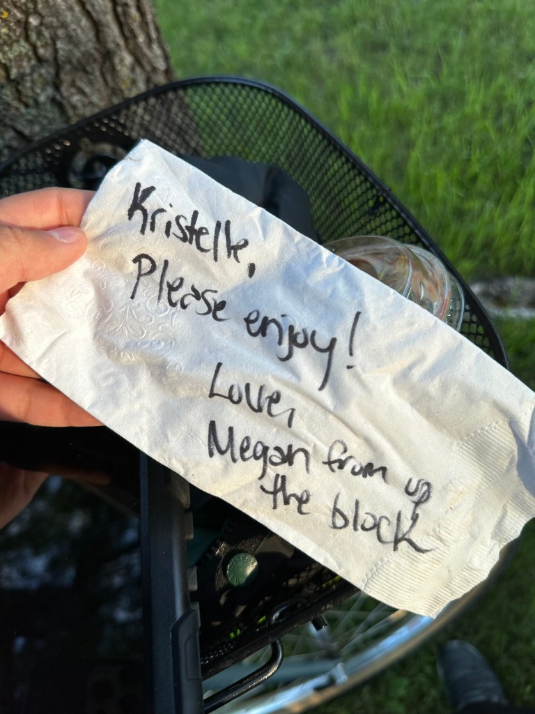 Kristelle: Kohtasin kirjanikku Jim Puppe, kes siis oma raamatu “Dakota Attitude” mulle andis (2021 ND bestseller?) ja pühenduse sisse kirjutas. Pani veel isetehtud salsa ja vorsti ka kaasa. Tagasi ratta juurde minnes avastasin korvist kausikese smuuti-šokolaadi-banaani-müsli seguga, mille üks emps sinna toonud oli!