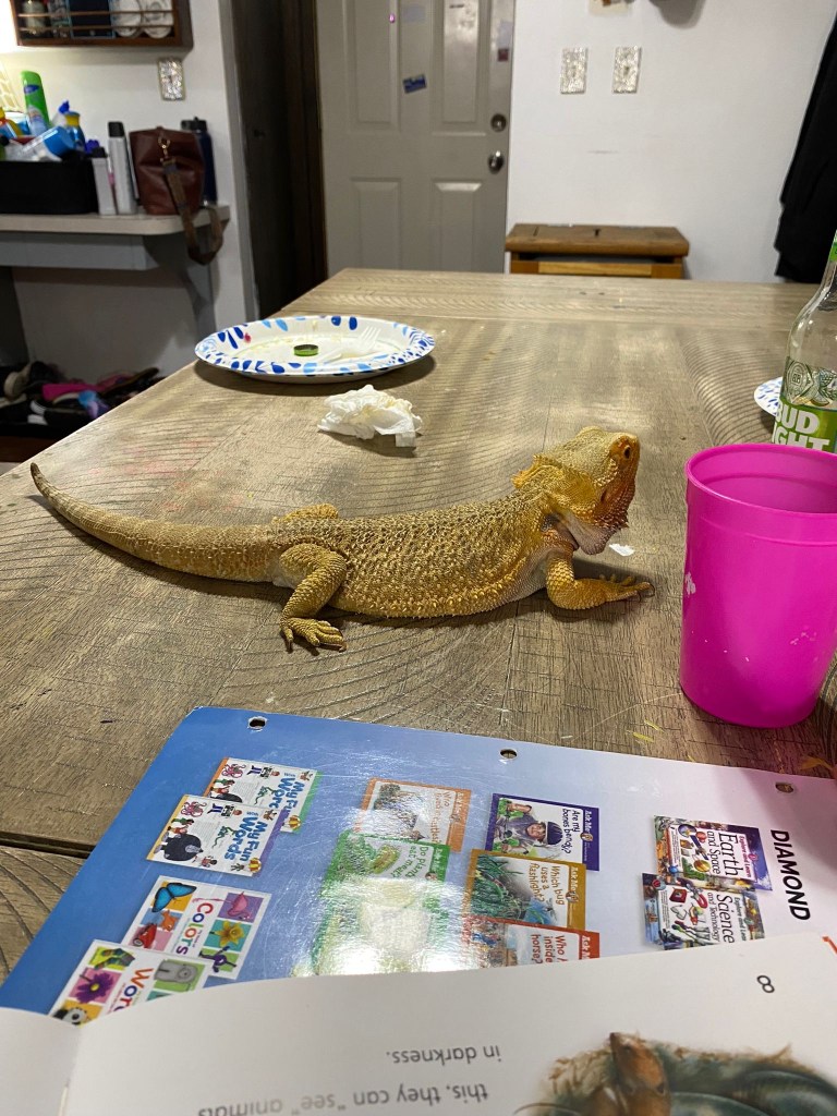 Evelyn: Sel nädalal kohtasin palju ägedaid loomi, näiteks mingit sisalikulaadset tegelast ja siis khte corgit, kellel mõlemal oli oma koht/alus, kus nad pidid kogu aeg olema. Nad ei tohtinud sealt enne ära tulla, kui perenaine lubas. Minu meelest see oli lihtsalt väga naljakas, kuna esiteks need ei paista eriti mugavad kohad neil pluss nad ei tahtnud üldse paigal püsida seega madistasid lihtsalt kohapeal.
