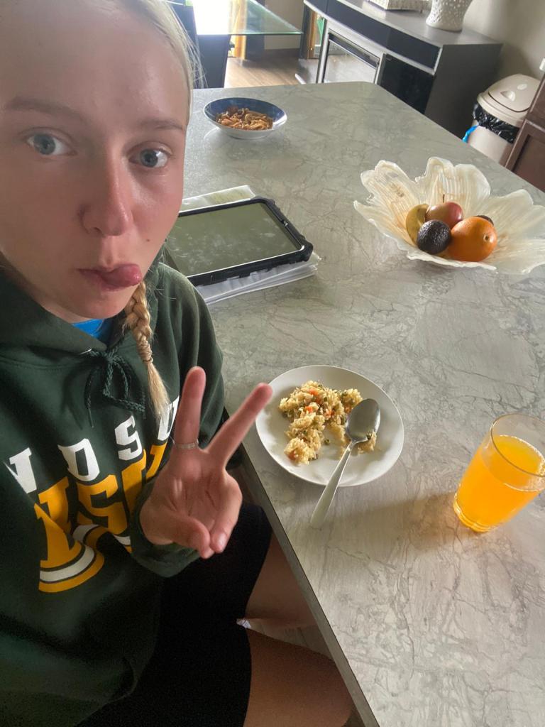 Evelyn: Üks naljakas lugu, mis see nädal juhtus, oli meie kella kolmene äratus. Nimelt teeme Kristelle ja Mirleniga iga päev kell kolm kas hundiratta, kukerpalli või keerutuse. Mina istusin just tol hetkel parasjagu ühe mampsiga maas ja kui varasemalt ma olen hoiatanud, et ma pean nüüd ühe keerutuse tegema, siis see kord ma seda ei teinud. Seega tõusin keset juttu püsti ja teen ühe ringi ümber enda, mis oli lihtsalt minu enda jaoks jube naljakas. Ausalt öeldes enamus asjad, mis ilmselt kõigi teie jaoks ei ole eriti tavapärased on siin juba üsna tavalised ja kõik need lood ei jää isegi meelde.