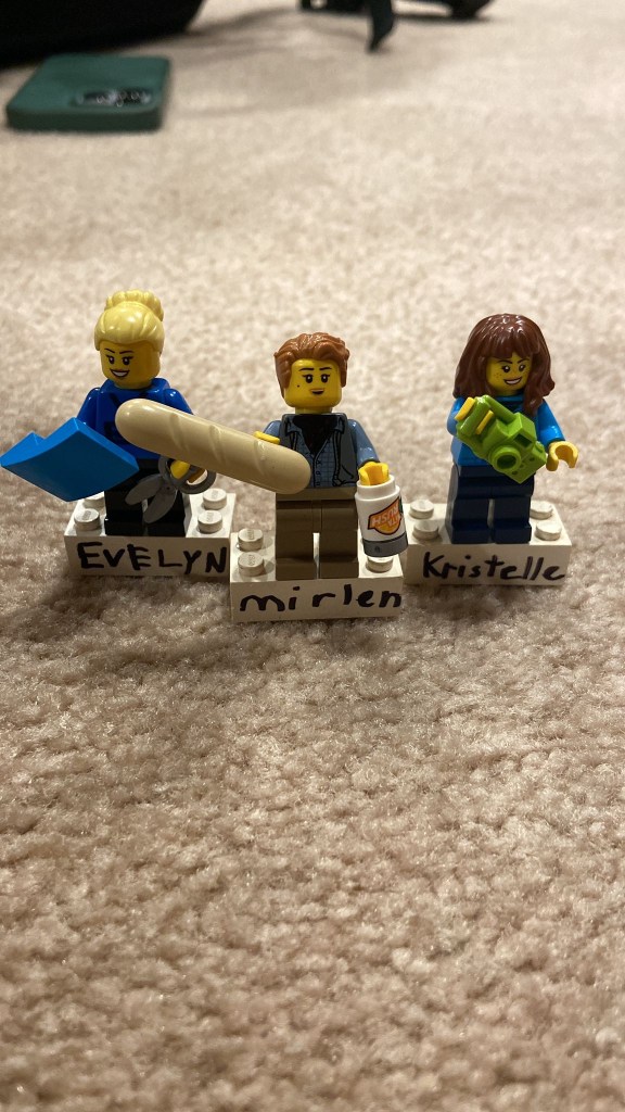 Evelyn: Selle nädala toredaim lugu on kindlasti see, kui üks väike tore poiss alustuseks legodest minu tegi ja siis küsis veel minu töökaaslaste kohta. Sama aeg kui mina tema vanematega jutustasin, meisterdas ta kõik kolm Jamestowni bookgirli valmis – Evelyn, Kristelle ja Mirlen. Ja sain lihtsalt korraliku kultuurišoki treilerpargis töötades 😀